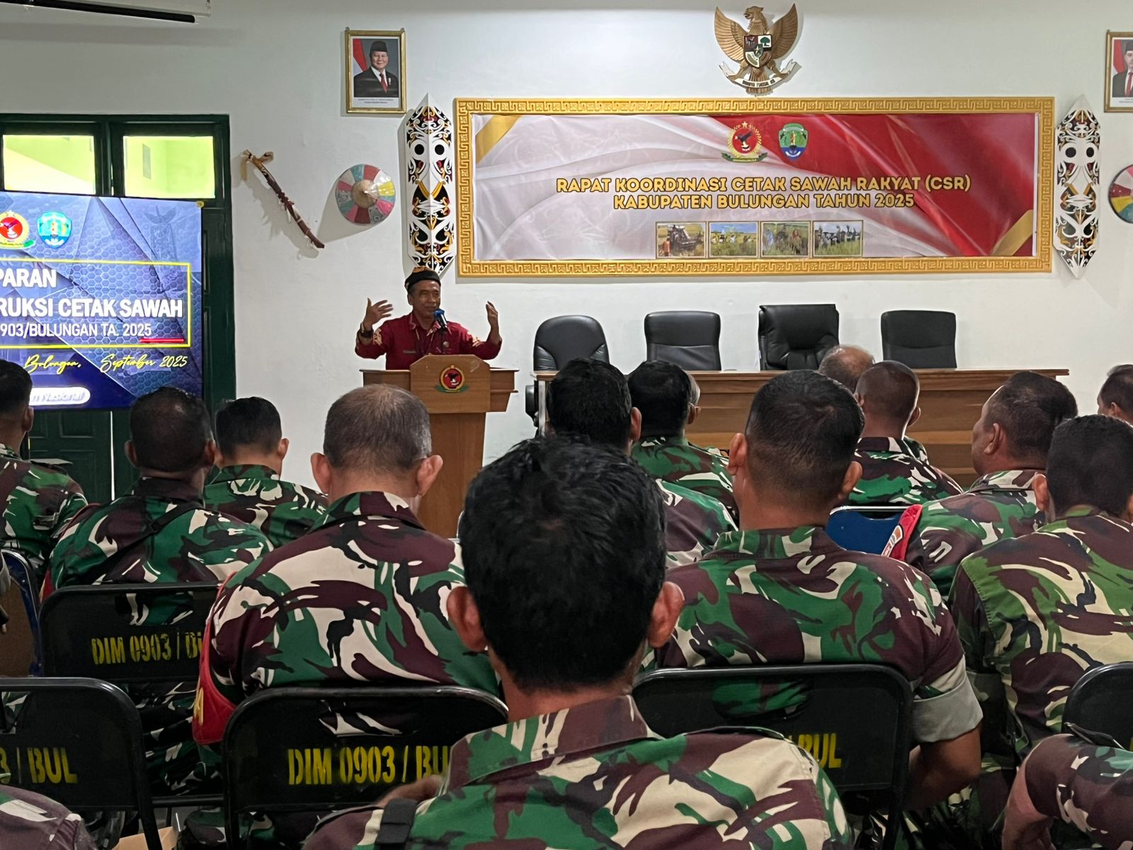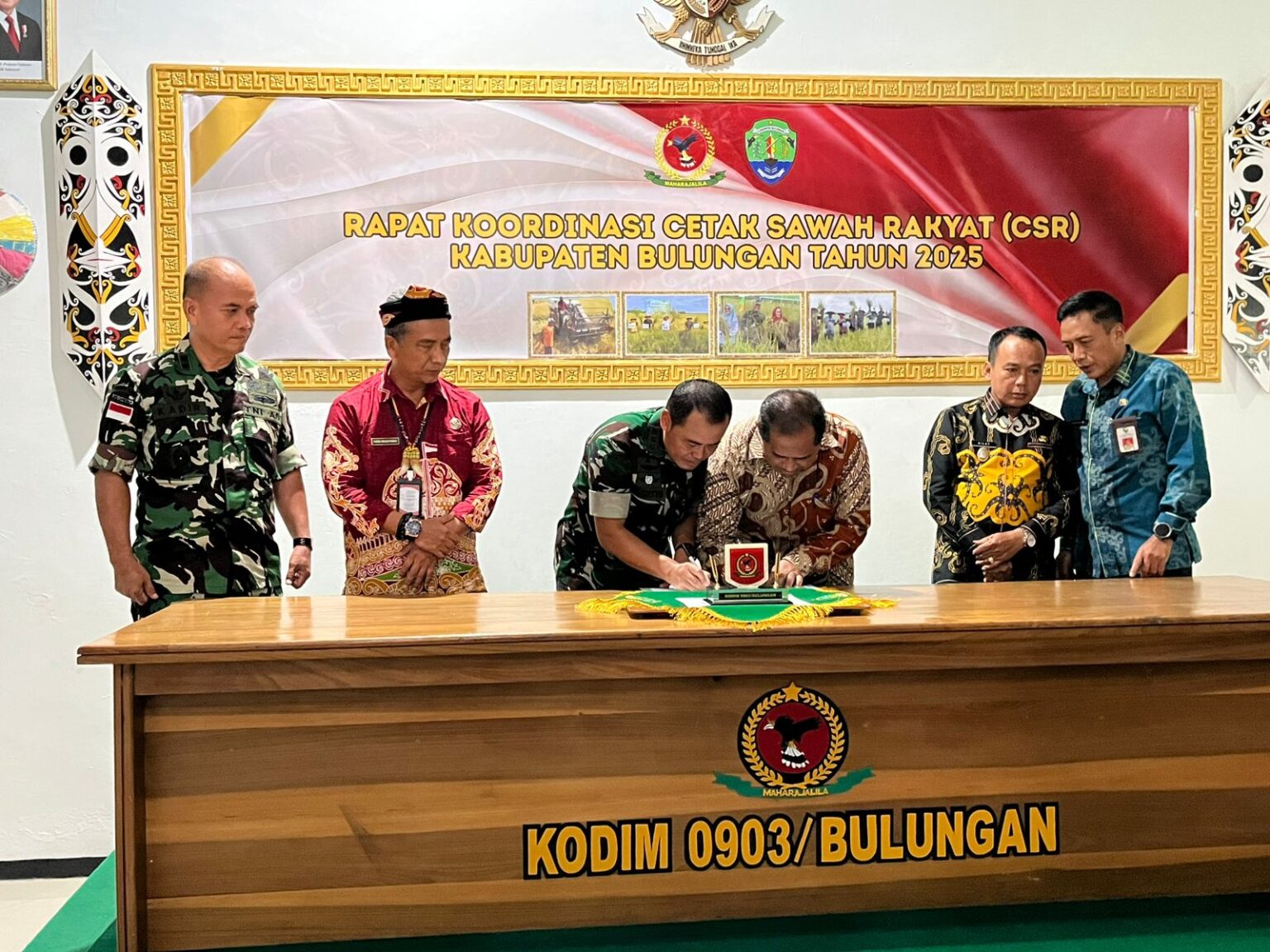Bulungan — Pemerintah Kabupaten Bulungan bersama Kodim Bulungan melaksanakan Penandatanganan Kontrak Cetak Sawah Rakyat sekaligus Rapat Koordinasi Evaluasi Optimasi Lahan di Kabupaten Bulungan.